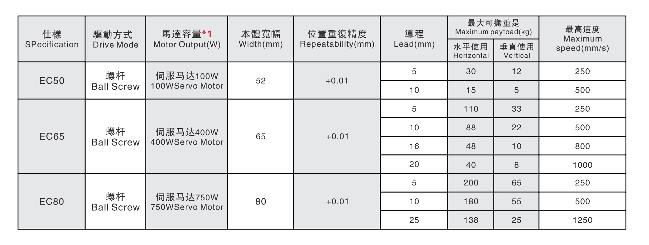 | 標準環境 | 滾珠螺桿 | EC 50 | 100瓦 | 52 | ±0.01 | 12 | 5 | 30 | 12 | 250 |