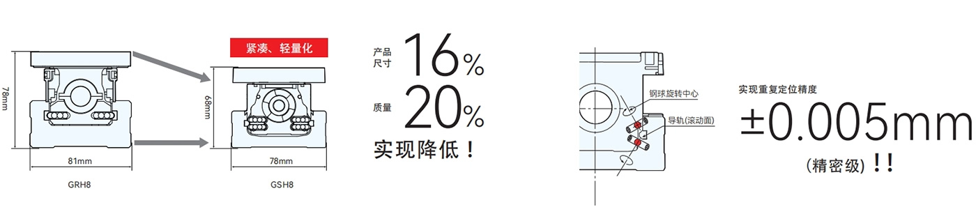 無間隙設計,可輕鬆順暢地滑入“圓弧槽”,易於長時間保持高精度。