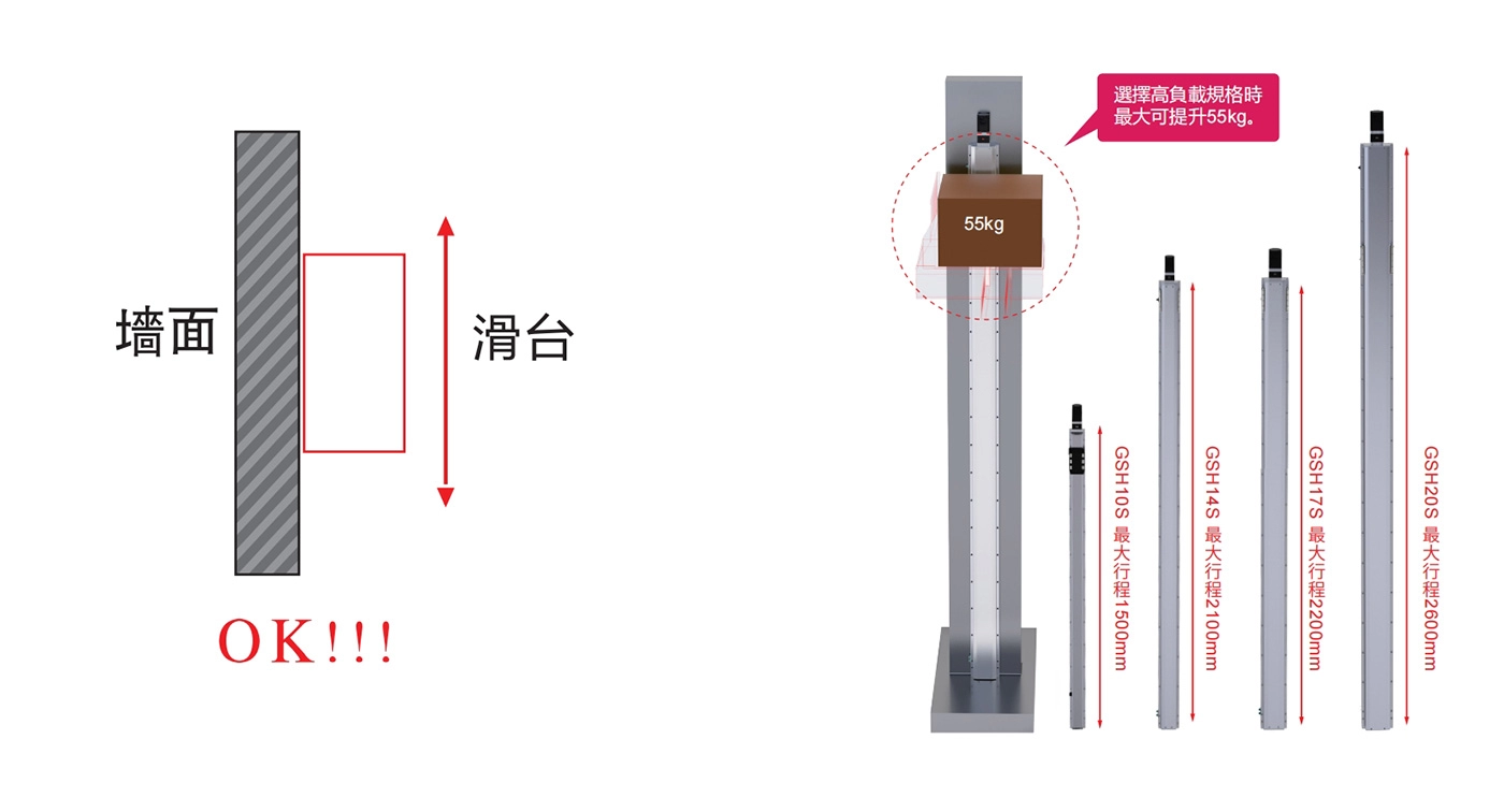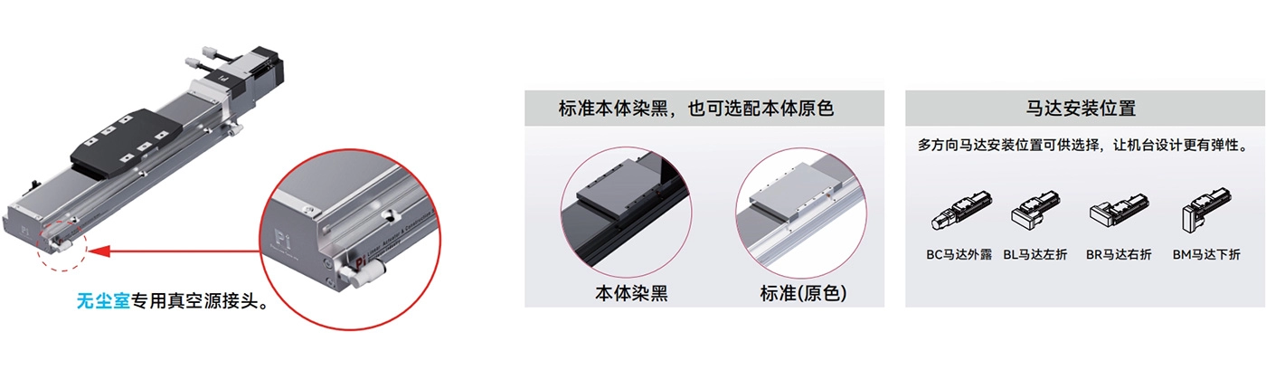 採用鋼帶防護,可防止異物直接落入滑台,減少粉塵產生;可在無塵室環境中使用,並可配備不同廠商生產的馬達和安裝方式。