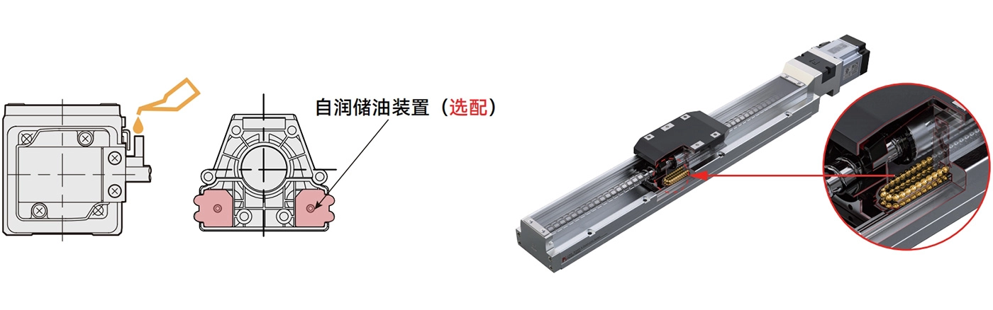此系列產品無需拆卸外殼即可進行外部潤滑。它採用特殊的鋼帶結構設計,並配備自潤滑油儲存系統。