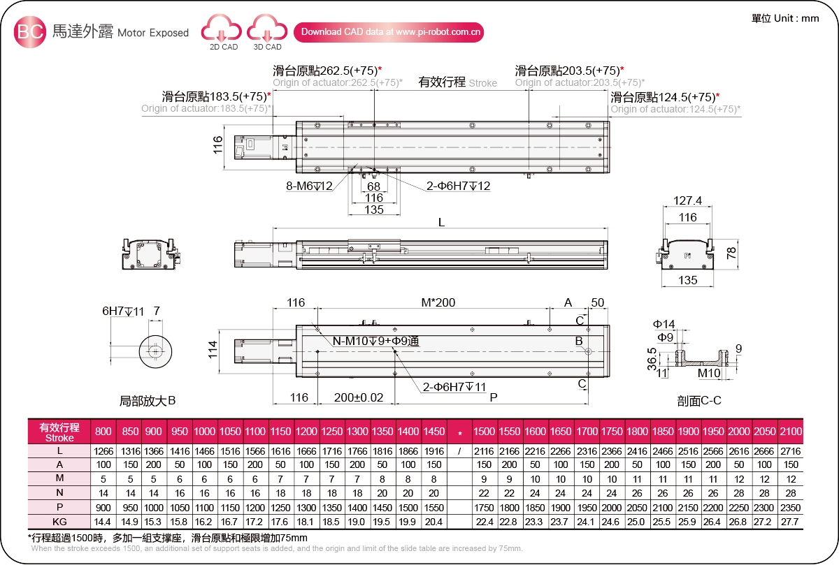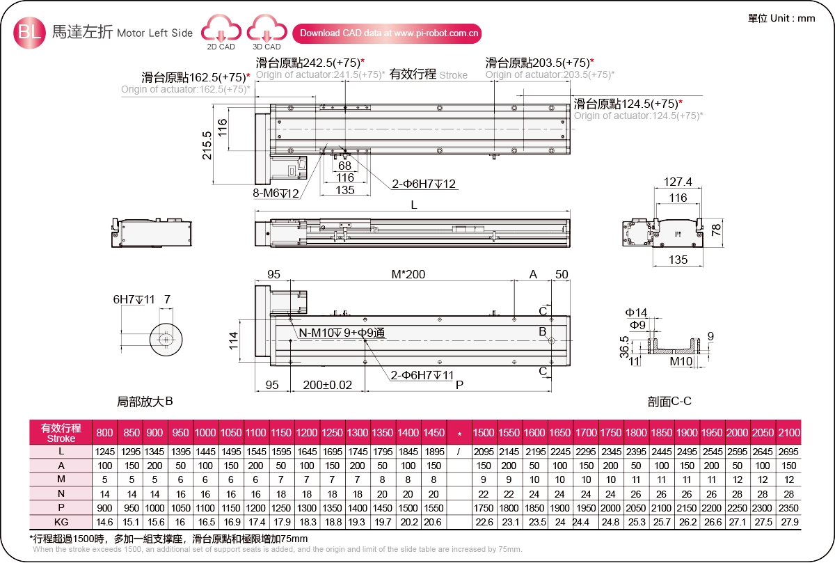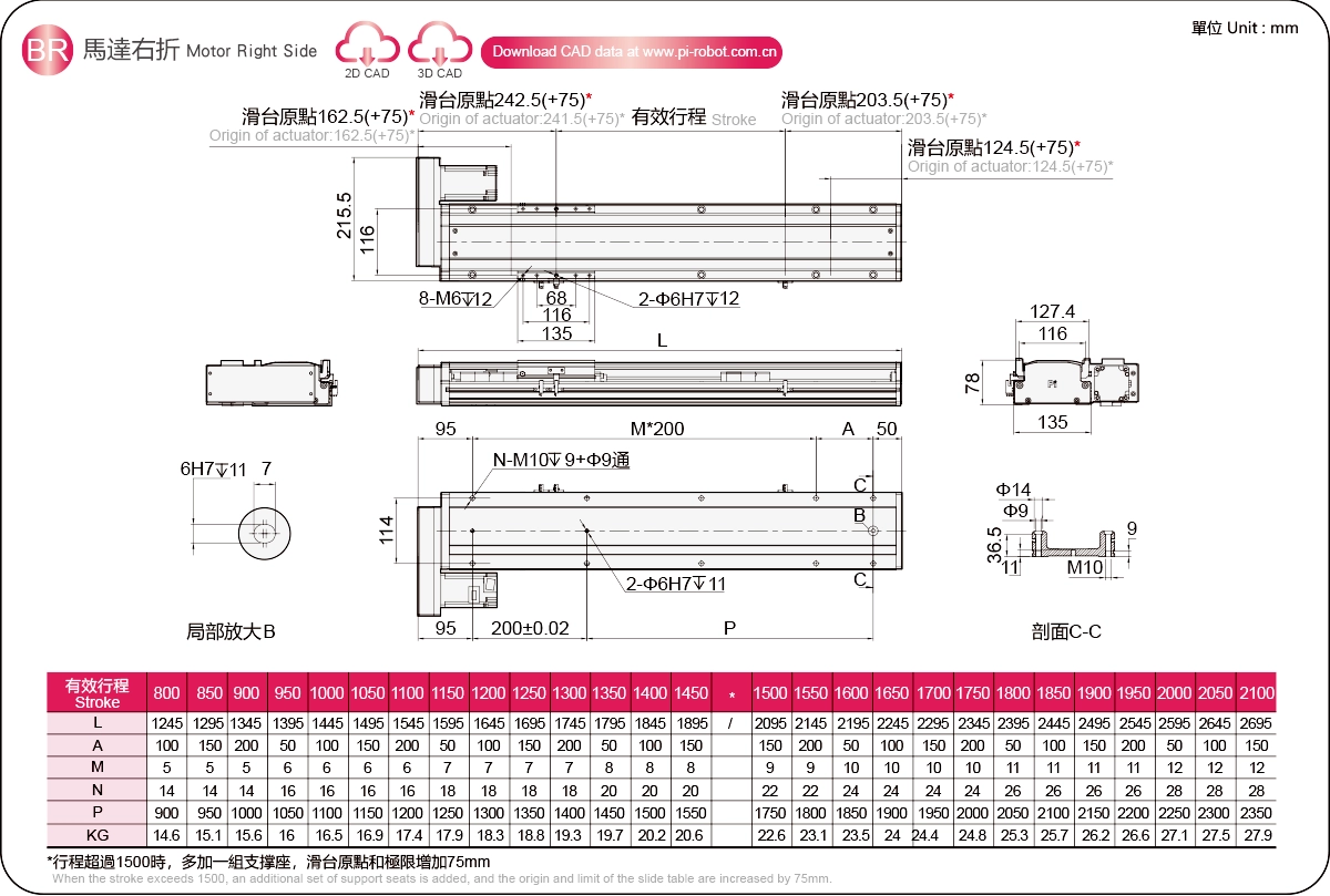 四柱滾珠螺桿嵌入式滑台,行程範圍達 3000 毫米,最大速度達 2200 毫米/秒。