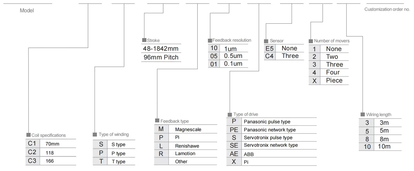 | 使用地點 | 驅動模式 | 型號規格 | 馬達規格 | 主體寬度(毫米) | 身體高度(毫米) | 重複性(毫米) | 連續推力(N) | 峰值推力(牛頓) | lrms(A) | 最大有效載荷(公斤) | 最高速度 (毫米/秒)*1 |