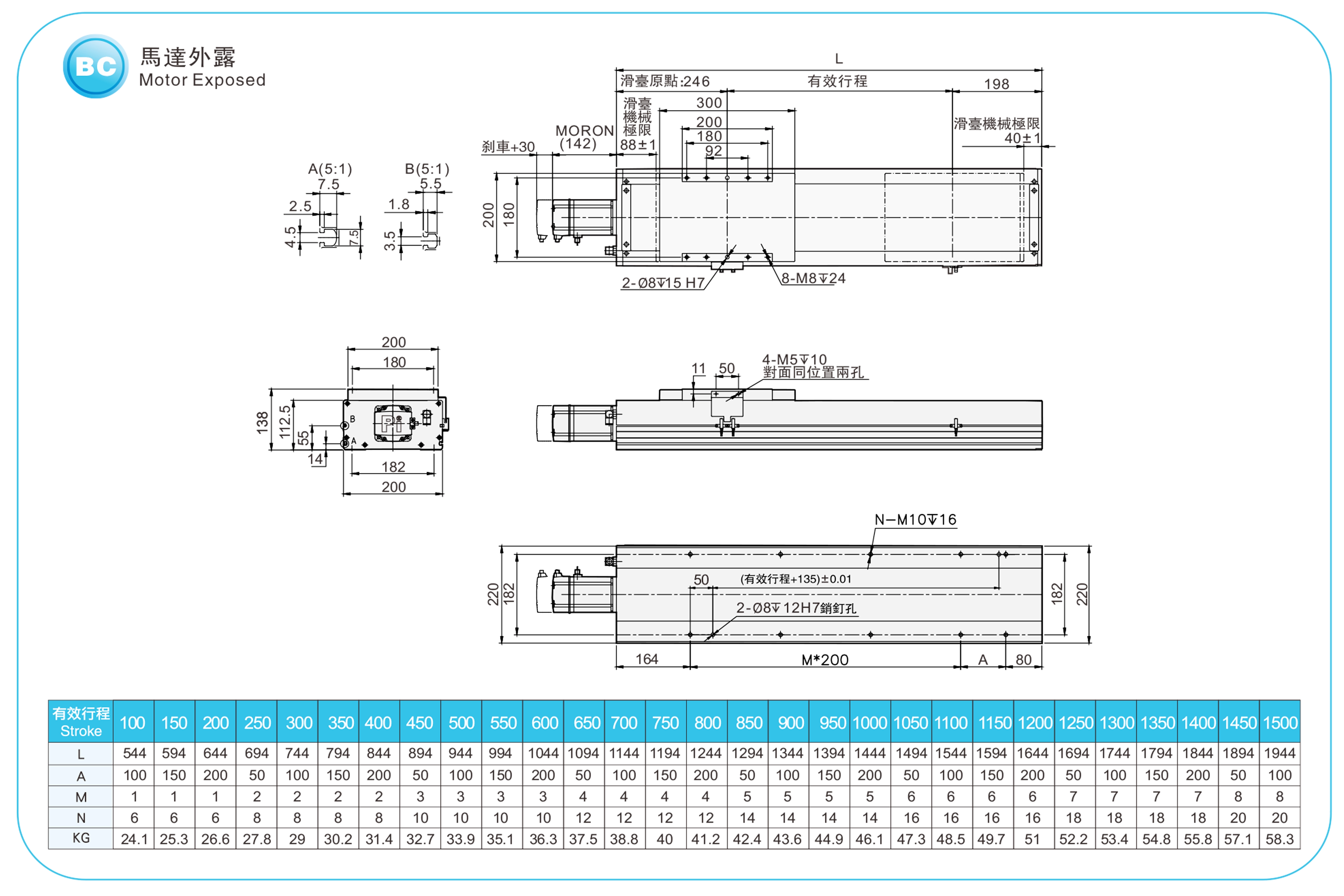 | 使用地點 | 驅動模式 | 型號規格 | 馬達輸出 (w) | 寬度(毫米) | 重複性 (毫米) | 滾珠螺桿規格 | 最大有效載荷(公斤) | 最高速度 (毫米/秒)*1 | ||