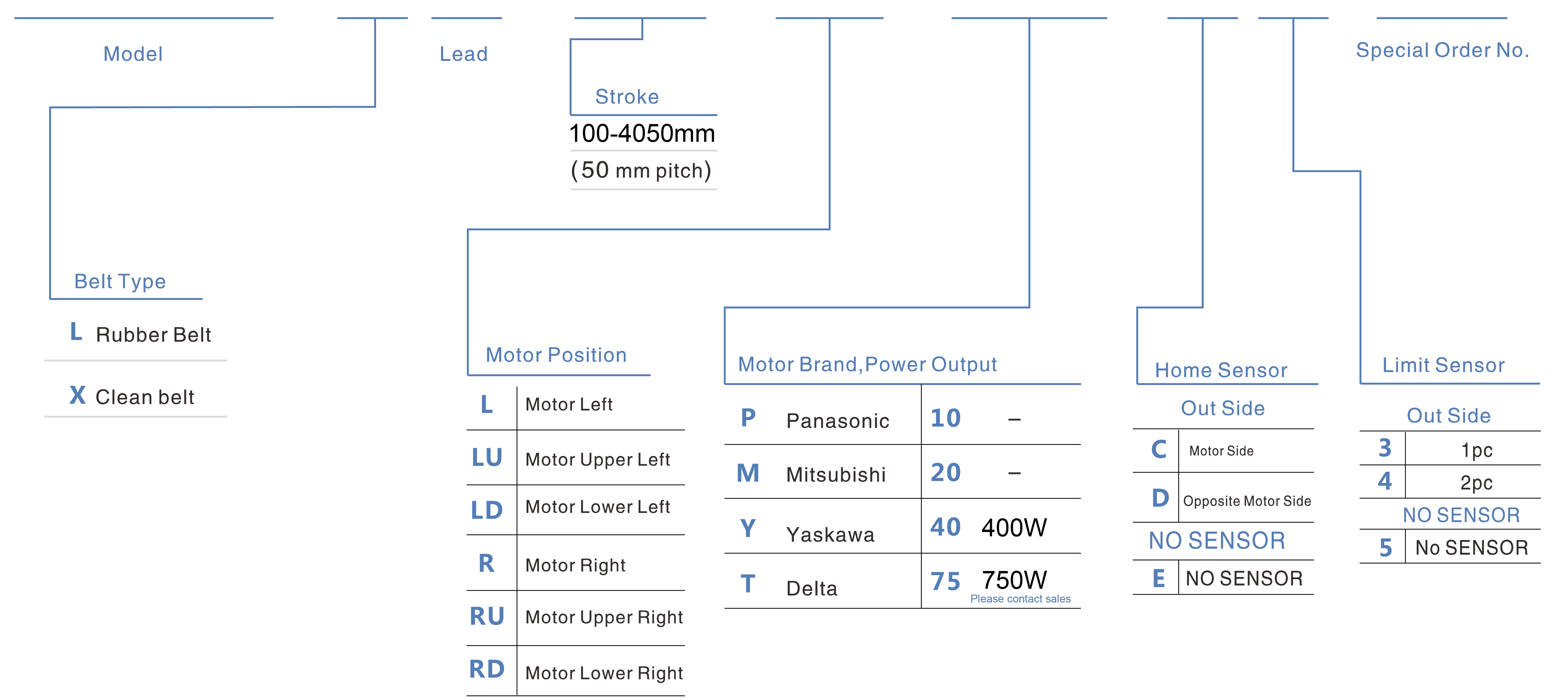 | 使用地點 | 驅動模式 | 型號規格 | 減速器機構 | 馬達輸出 (w) | 寬度(毫米) | 重複性 (毫米) | 皮帶規格 | 最大有效載荷(公斤) | 最高速度 (毫米/秒)*1 | ||