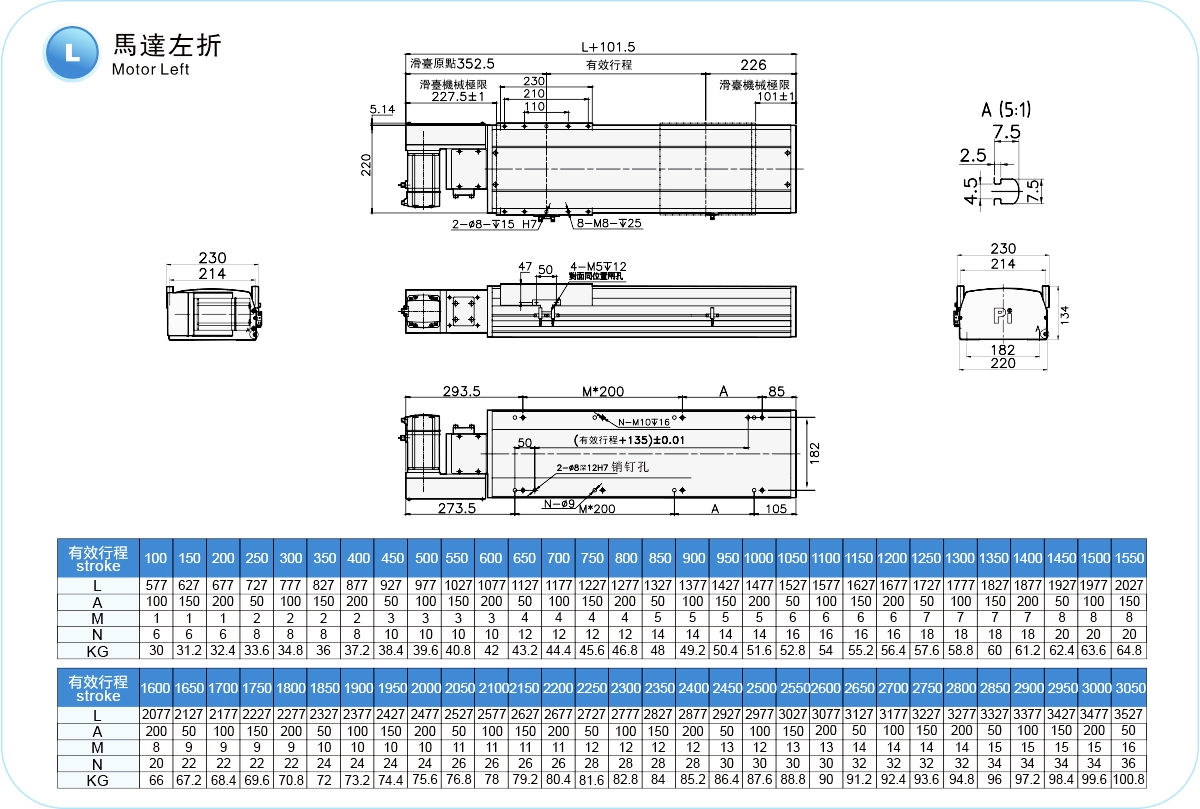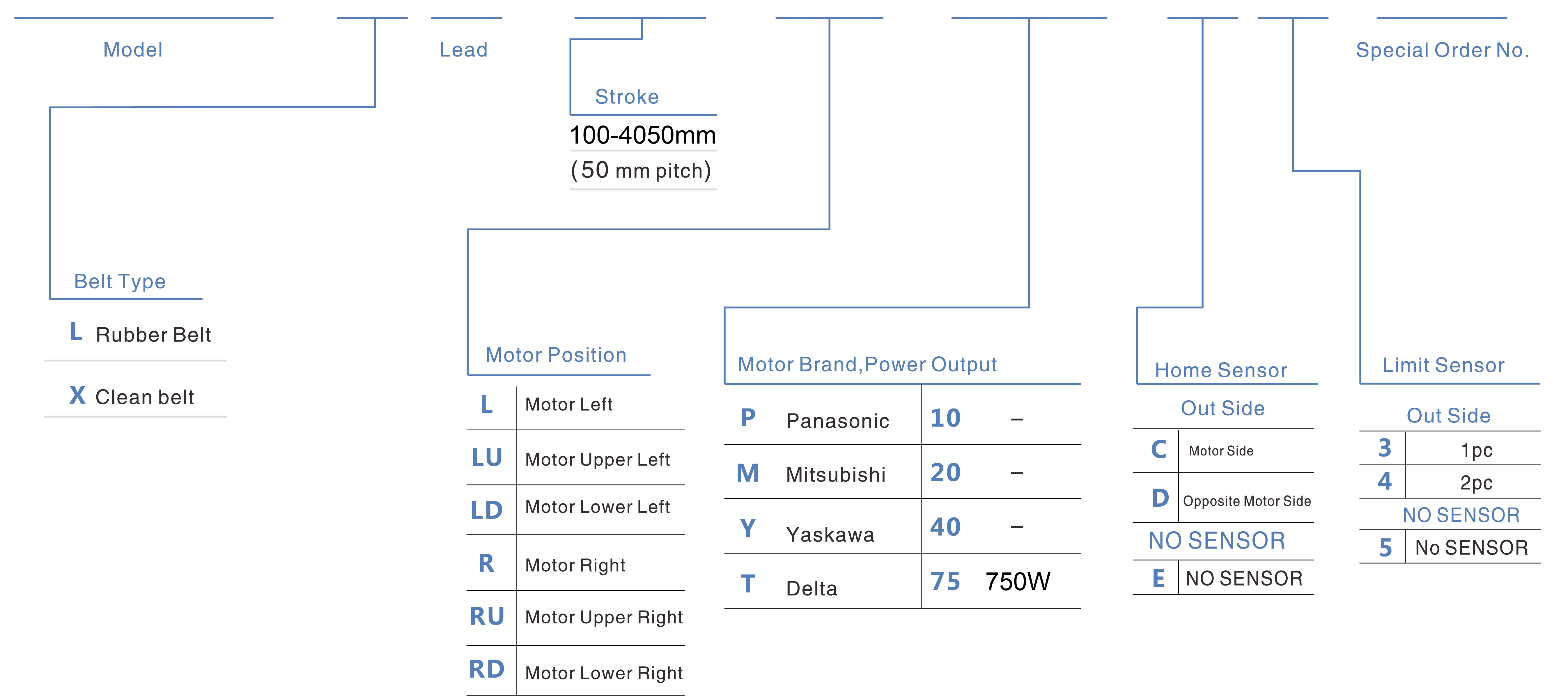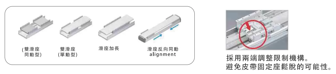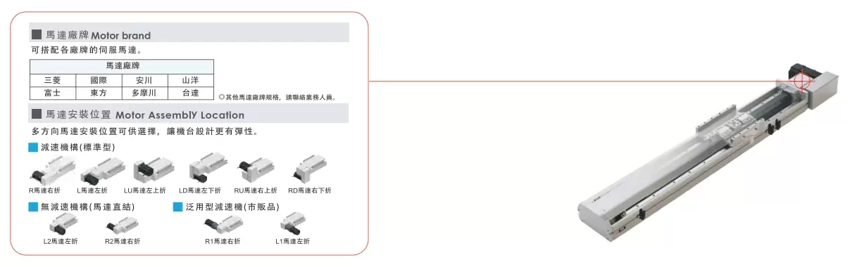 | 使用地點 | 驅動模式 | 型號規格 | 減速器機構 | 馬達輸出 (w) | 寬度(毫米) | 重複性 (毫米) | 皮帶規格 | 最大有效載荷(公斤) | 最高速度 (毫米/秒)*1 | ||