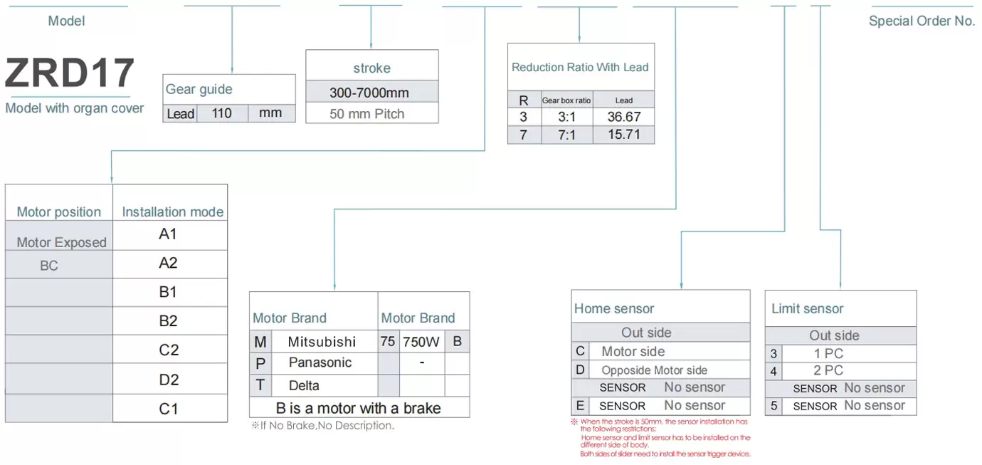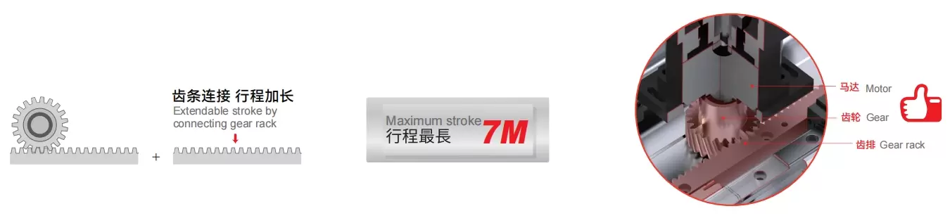 由於採用了齒輪傳動,長行程中不會有絲槓驅動,因此不會出現絲槓纏繞問題。傳動結構由齒條進行線性驅動。