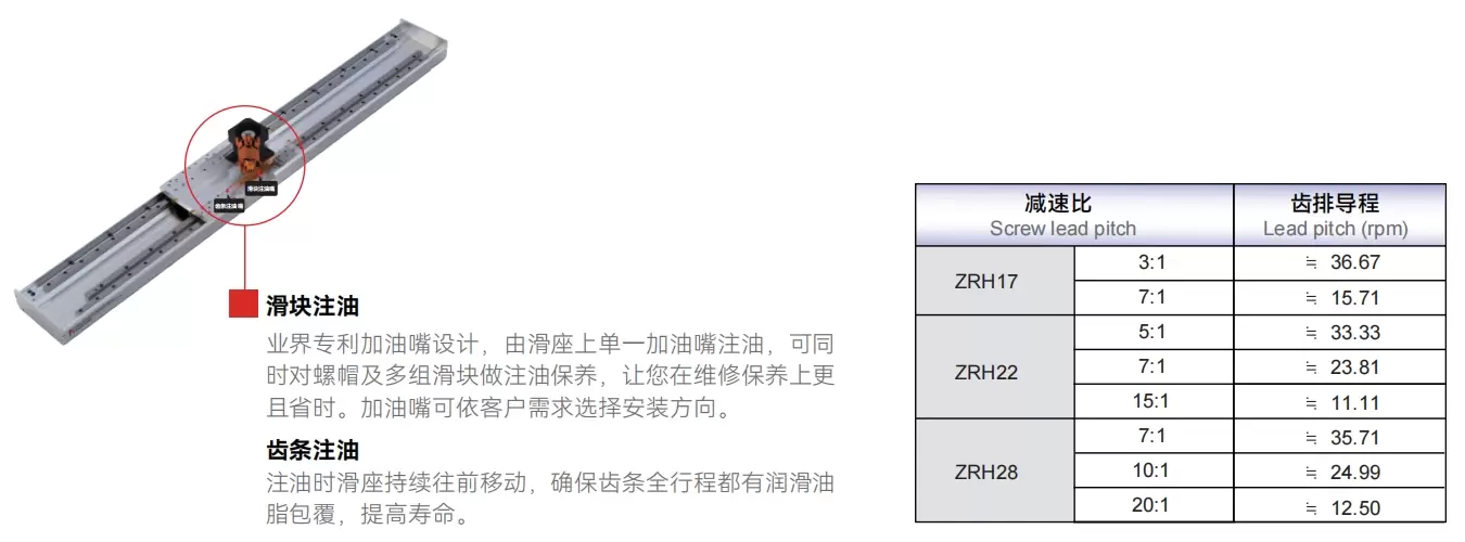 所有系列產品均可進行外部注油,無需拆卸外殼。自潤滑油儲存系統可依不同的負載和轉速,並配備適當的減速比規格和導程。