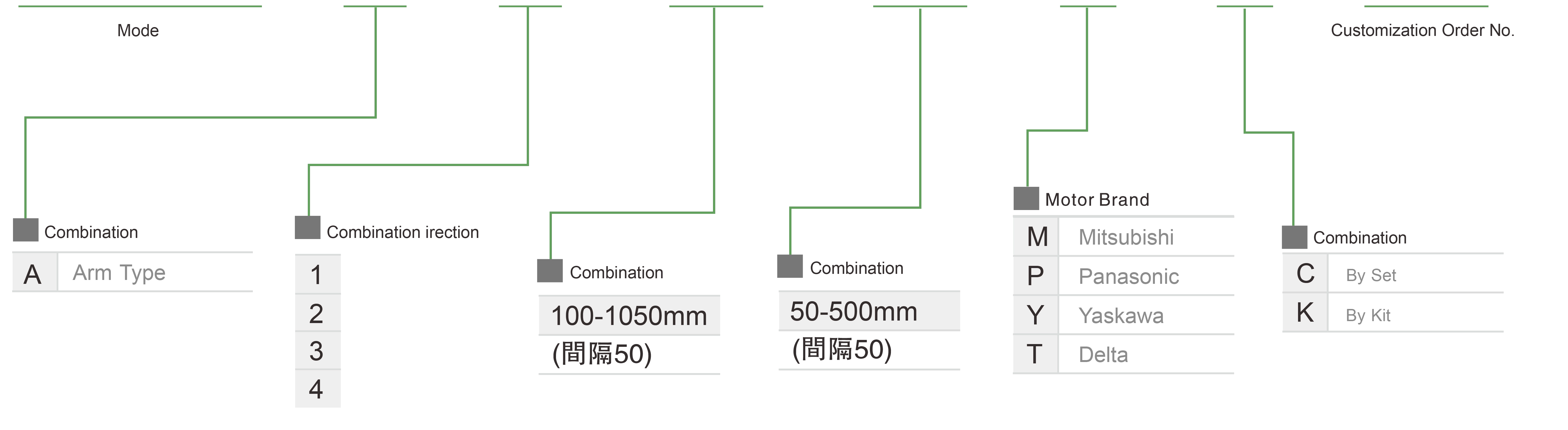 | 使用地點 | 驅動模式 | 型號規格 | 組合 | 軸編號 | 帶領 | 最大速度(毫米/秒) | 行程(毫米) | ||||||