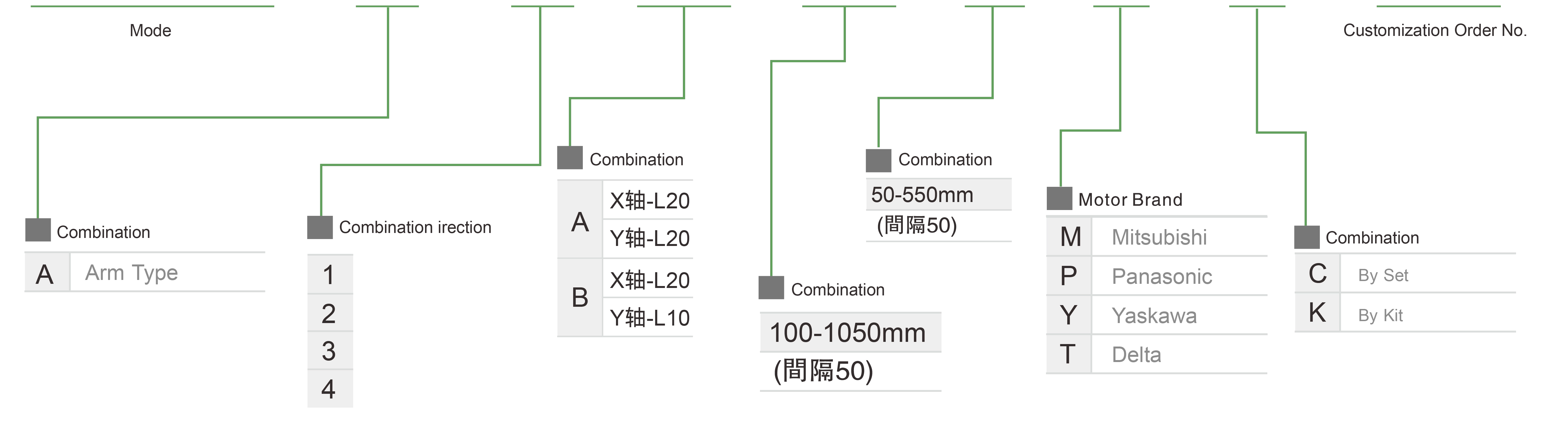 | 使用地點 | 驅動模式 | 型號規格 | 組合 | 軸編號 | 帶領 | 最大速度(毫米/秒) | 行程(毫米) | ||||||