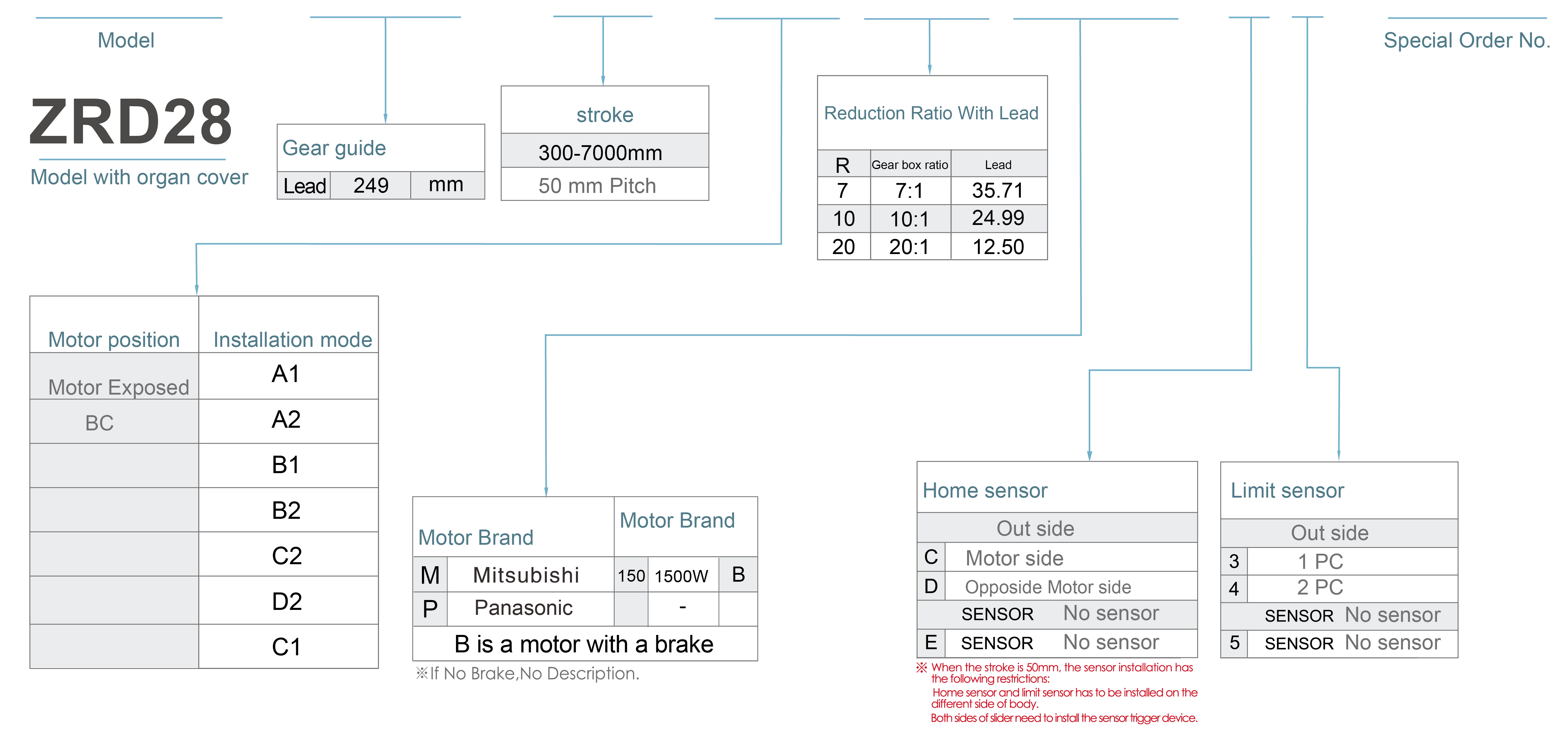 | 使用地點 | 驅動模式 | 型號規格 | 馬達輸出功率(瓦) | 寬度(毫米) | 重複性(毫米) | 遞減者比例 | 螺旋齒輪尺寸(毫米) | 最大有效載荷(公斤) | 最高速度 (毫米/秒)*1 | |||